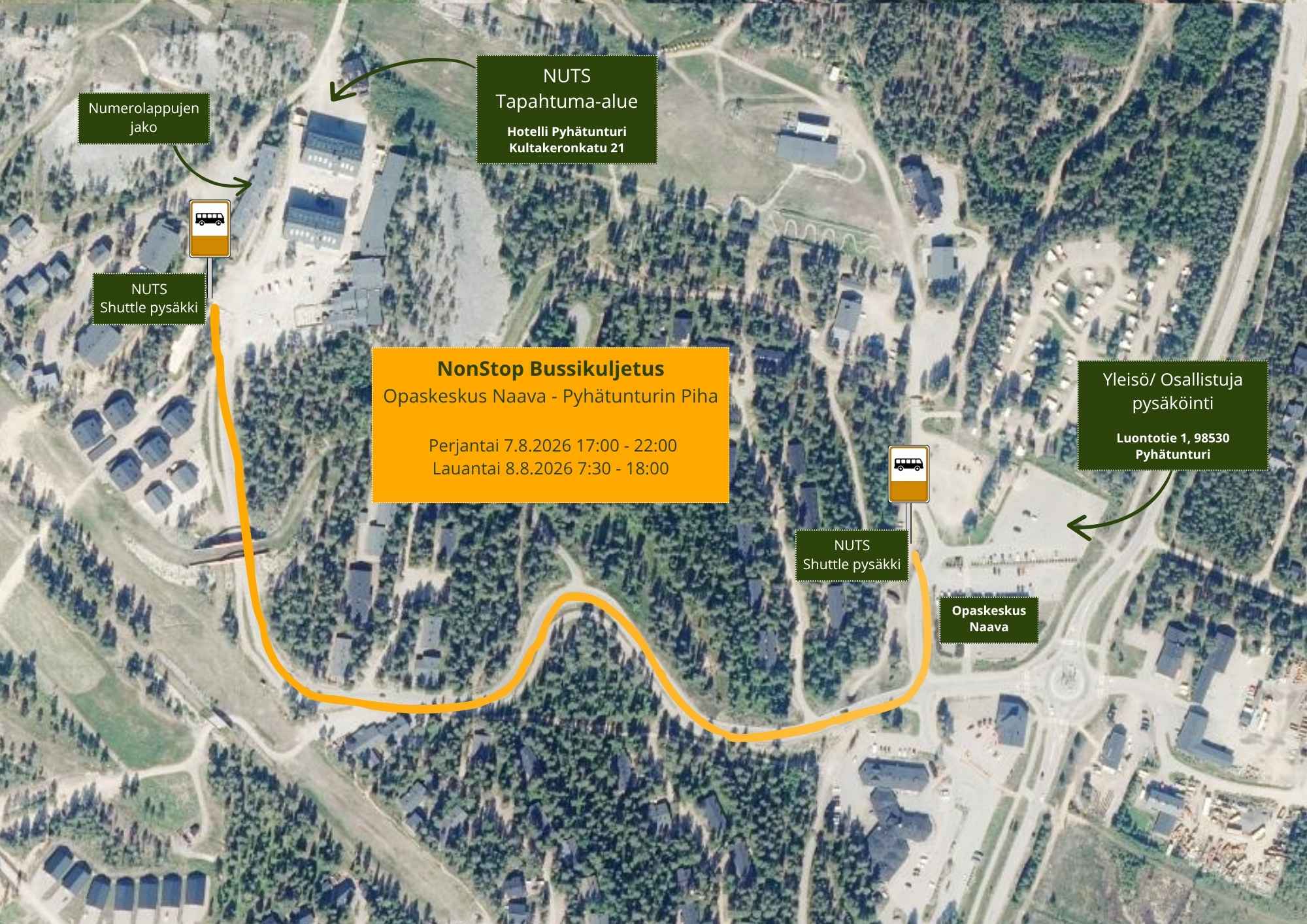 NUTS Pyhän tapahtumakeskus sijaitsee Hotelli Pyhätunturin pihapiirissä. Hotellin edessä on rajatusti parkkitilaa, jonka vuoksi suosittelemme omalla autolla tullessa parkkeeraamaan auton Luontokeskus Naavan tai Polarrinne Parking -pysäköintialueelle ja käyttämään NUTS Shuttle bussi kuljetusta.